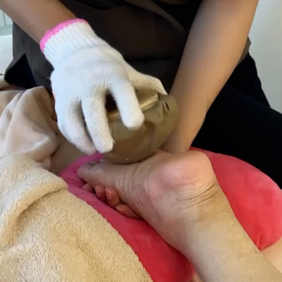 もぐさ(ヨモギ)を燃やしたセラミックカップを背中・お尻・足・お腹などにじっくり当てていき、骨の髄からしっかり温めていきます。